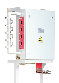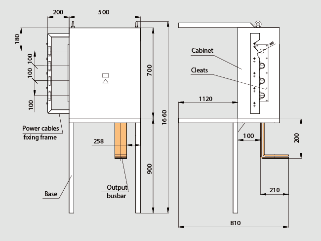 The bus bars go through the bottom for connection to contact rail. Frames for cables mechanical fixing are installed on the side of the cabinet. The foundation is provided for cabinet installation on proper location.