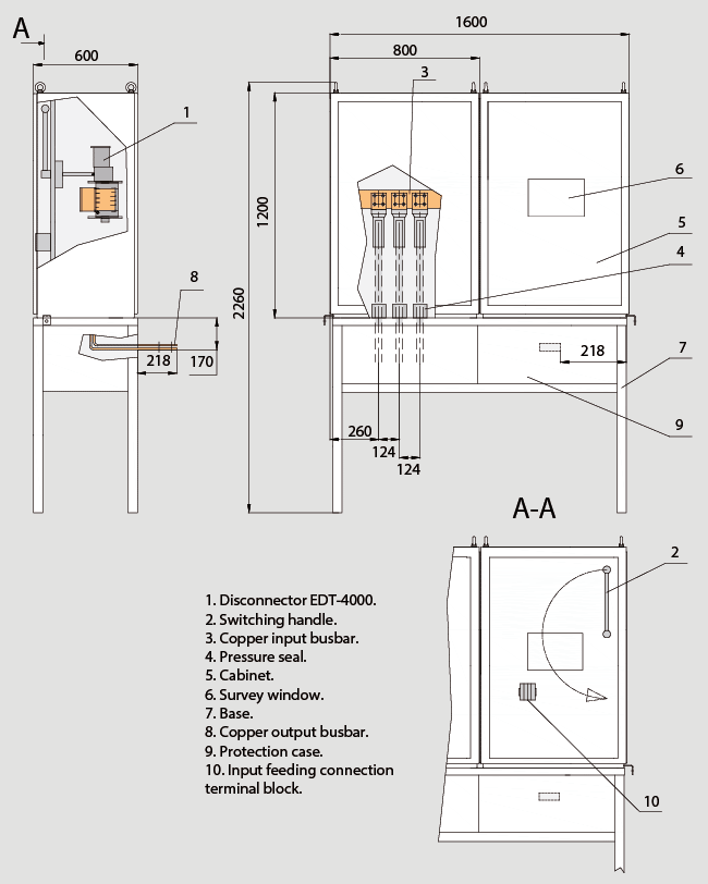 Switch Operation Switchgear with Disconnectors is structurally made in a form of metal two-sectional double-side serviced cabinet. One disconnector type EDT 4000 with visible double break is installed in the right section. Busbar for cables connection is in the left section. The cabinet has doors locked with the help of a key. The right section door is equipped with survey window for disconnector contacts position observation.